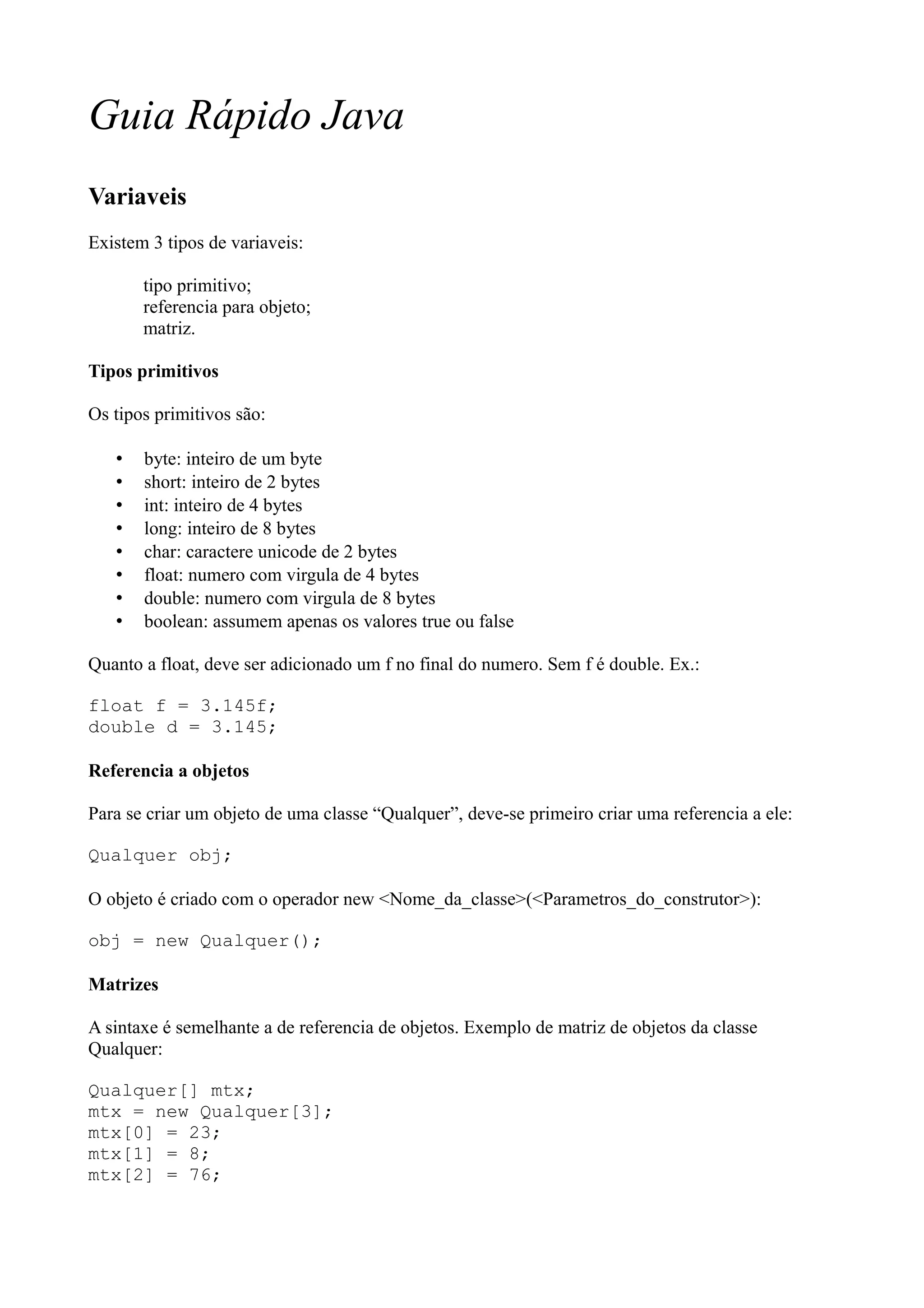 1) O documento apresenta os principais conceitos sobre variáveis, tipos primitivos, referências a objetos e matrizes na linguagem Java. 2) Inclui também uma explicação sobre classes, métodos, atributos, herança, polimorfismo, sobrecarga e outros pilares da programação orientada a objetos no Java. 3) Por fim, aborda tópicos como coletor de lixo, empacotadores, classe Math e outros recursos do framework Java.