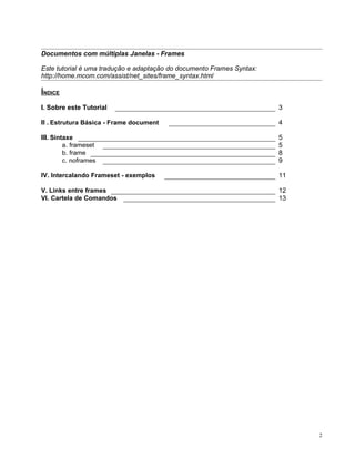 Este documento fornece um tutorial sobre a utilização de frames no HTML. Ele explica a estrutura básica de um documento de frames, a sintaxe das marcações <frameset>, <frame> e <noframes> e fornece exemplos de como intercalar múltiplas janelas.