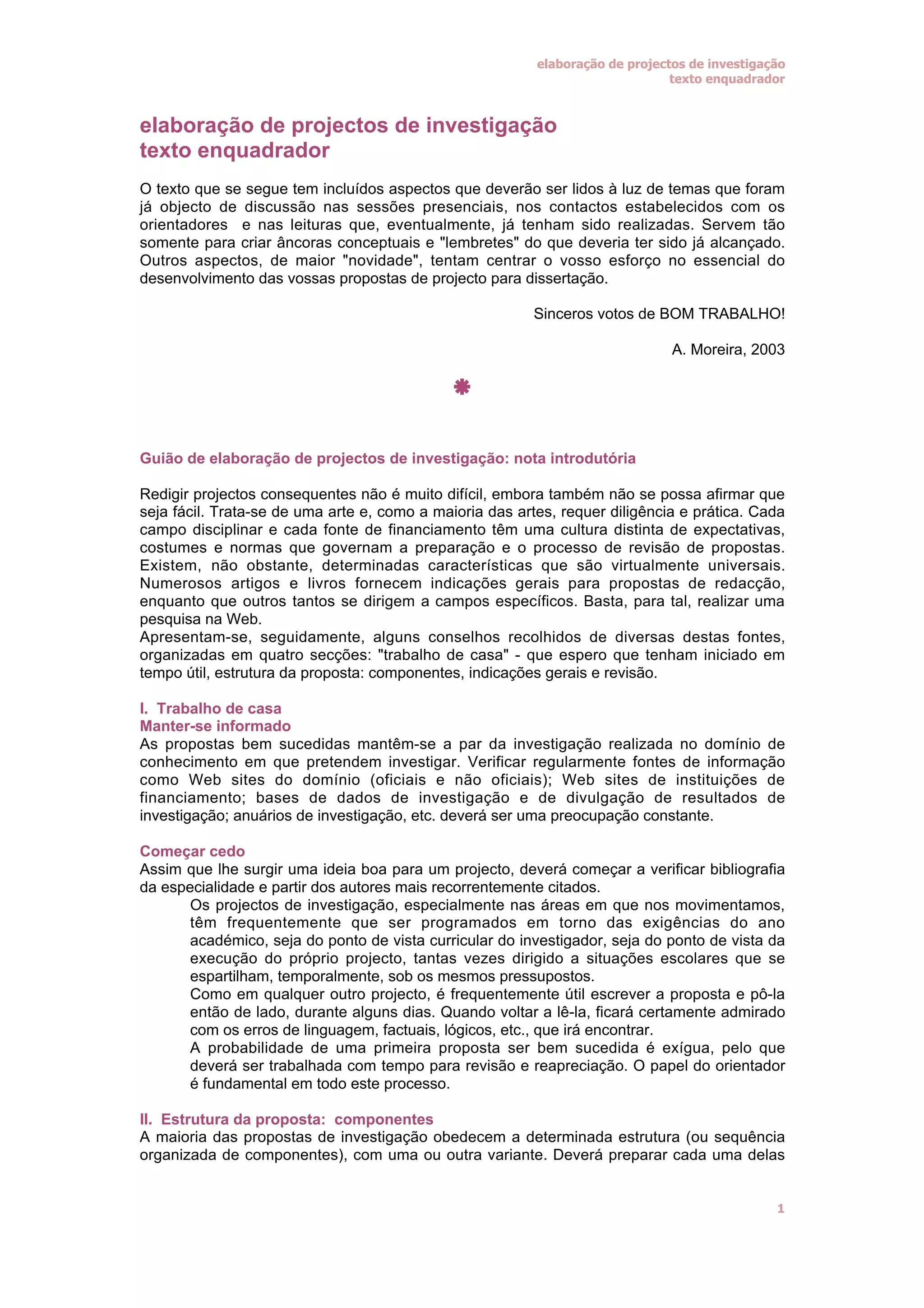 Este documento fornece orientações para a elaboração de projetos de investigação, abordando tópicos como: 1) trabalho de casa, como manter-se informado e começar cedo; 2) estrutura da proposta, incluindo título, resumo, introdução, objetivos, enquadramento teórico e metodologia; 3) cronograma e importância do projeto. O texto visa ajudar na preparação de propostas bem estruturadas e convincentes.