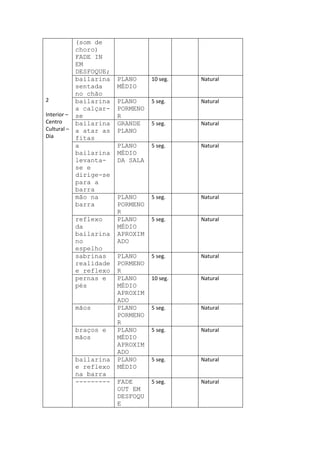 O documento descreve cenas de uma bailarina se preparando e dançando através de uma série de planos, ângulos e iluminação. A bailarina é vista se alongando nos bastidores, entrando em palco para dançar, e depois sentada nos bastidores removendo sua maquiagem com lágrimas nos olhos.