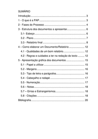 2) Fornece detalhes sobre a estrutura requerida para cada documento da PAP, como a capa, identificação do aluno e objetivos;