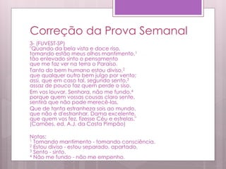 Este documento apresenta um soneto de Camões que descreve a admiração do poeta por uma mulher e as qualidades que a tornam superior ao mundo. Em seguida, pede para caracterizar a concepção de mulher no poema e apontar duas características do soneto que o filiam ao Classicismo, explicando-as brevemente.
