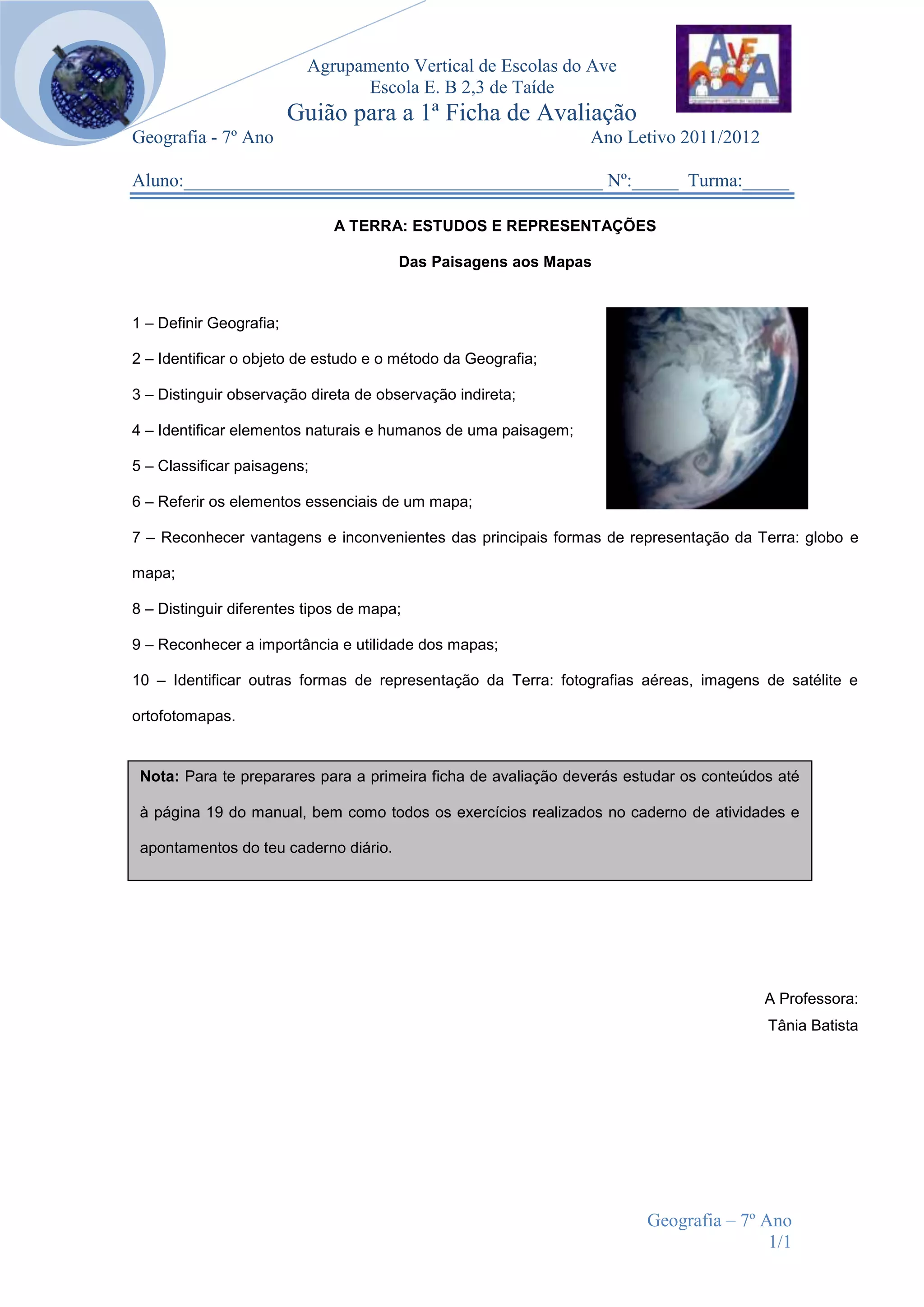 1. O documento é um guia para a primeira ficha de avaliação de Geografia do 7o ano sobre os estudos e representações da Terra.