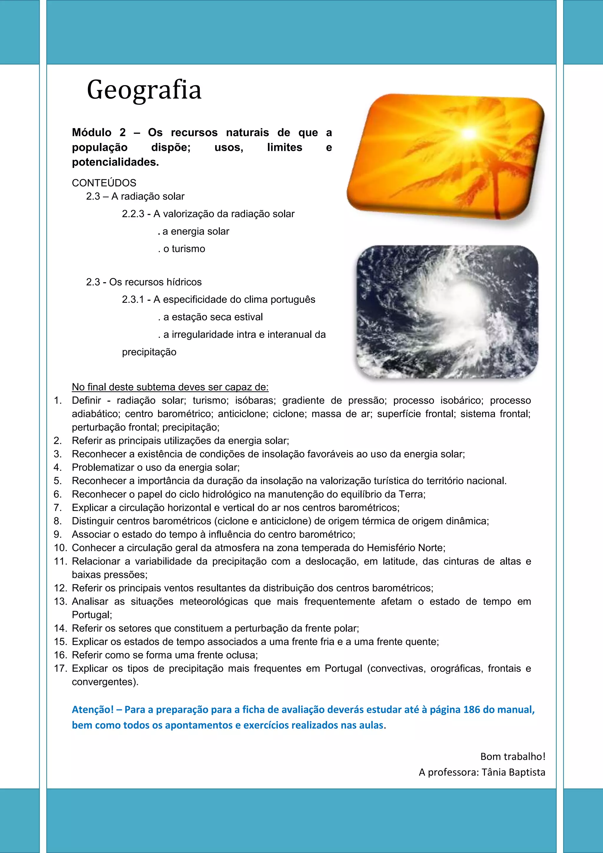 O documento discute os recursos naturais de Portugal, incluindo a radiação solar e os recursos hídricos. A radiação solar pode ser usada para energia solar e turismo devido às condições favoráveis de insolação. Os recursos hídricos são afetados pelo clima seco de verão e pela irregularidade das chuvas dentro e entre anos.