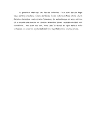 O documento discute a carreira do tenista suíço Roger Federer. Ele nasceu na Suíça em 1981 e é considerado um dos melhores jogadores de tênis de todos os tempos, tendo conquistado vários recordes como 16 títulos de Grand Slam. Federer liderou o ranking mundial por mais tempo que qualquer outro jogador e fundou uma organização de caridade para ajudar crianças na África do Sul.