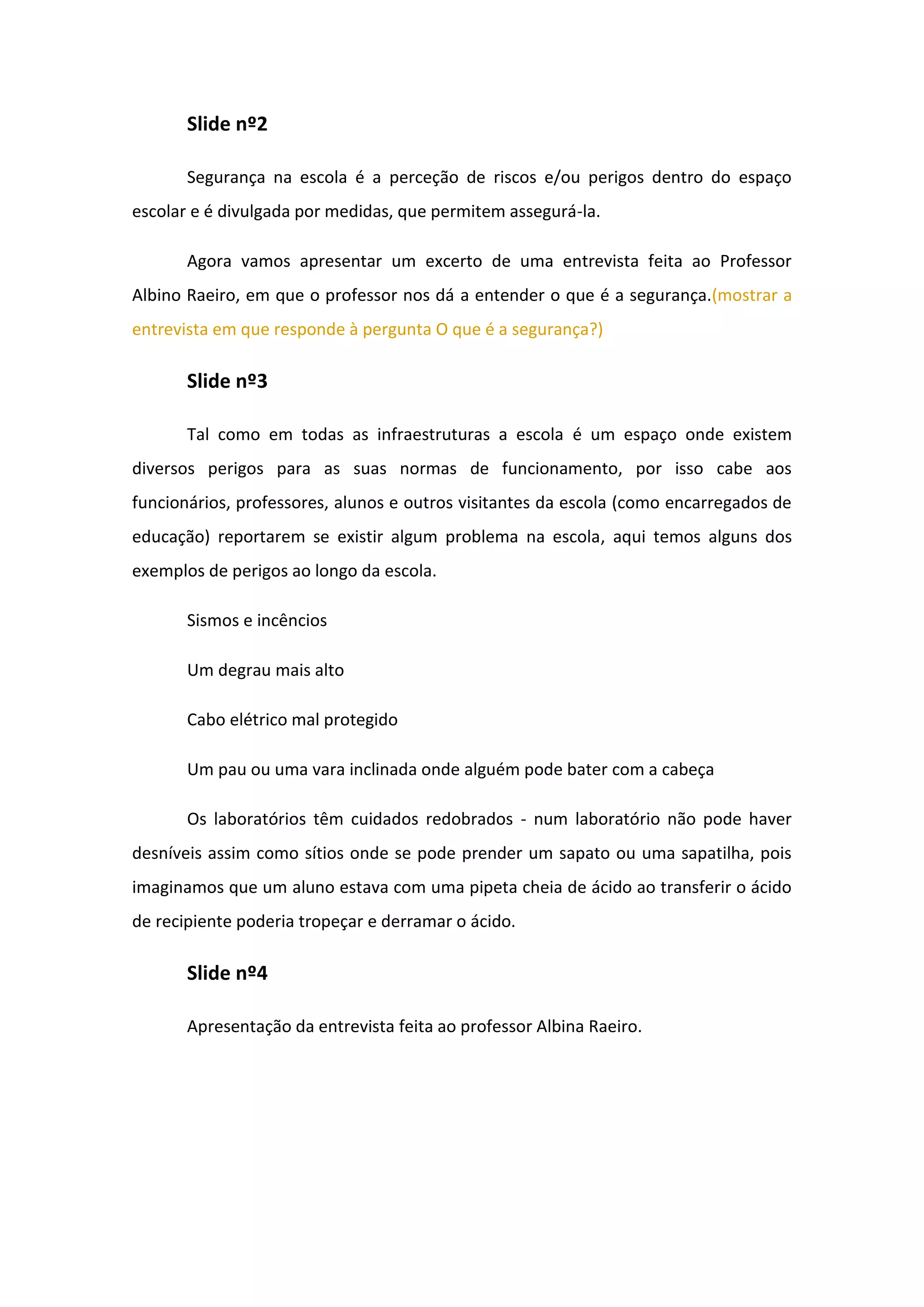 O documento discute a segurança nas escolas, definindo-a como a percepção de riscos e perigos no ambiente escolar. Apresenta exemplos de potenciais perigos como degraus altos, cabos elétricos expostos e laboratórios desorganizados. Também lista medidas de prevenção comuns em escolas, como sinalização de segurança, simulacros de emergência, e equipamentos como extintores e saídas de emergência.