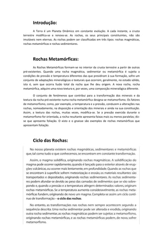 1) O documento discute os três principais tipos de rochas - rochas magmáticas, rochas metamórficas e rochas sedimentares.