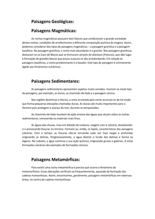 3) O documento também descreve diferentes paisagens geológicas associadas aos três tipos de rochas.