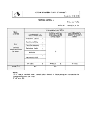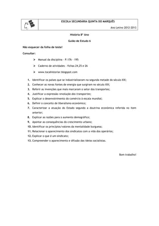 O documento fornece instruções para um guia de estudo de História do 8o ano sobre o mundo industrializado no século XIX. Os alunos devem identificar países industrializados, novas fontes de energia, invenções nos transportes, e explicar conceitos como liberalismo econômico e crescimento urbano. Inclui também links para recursos online e uma lista de tópicos a estudar para um teste sobre o tema.