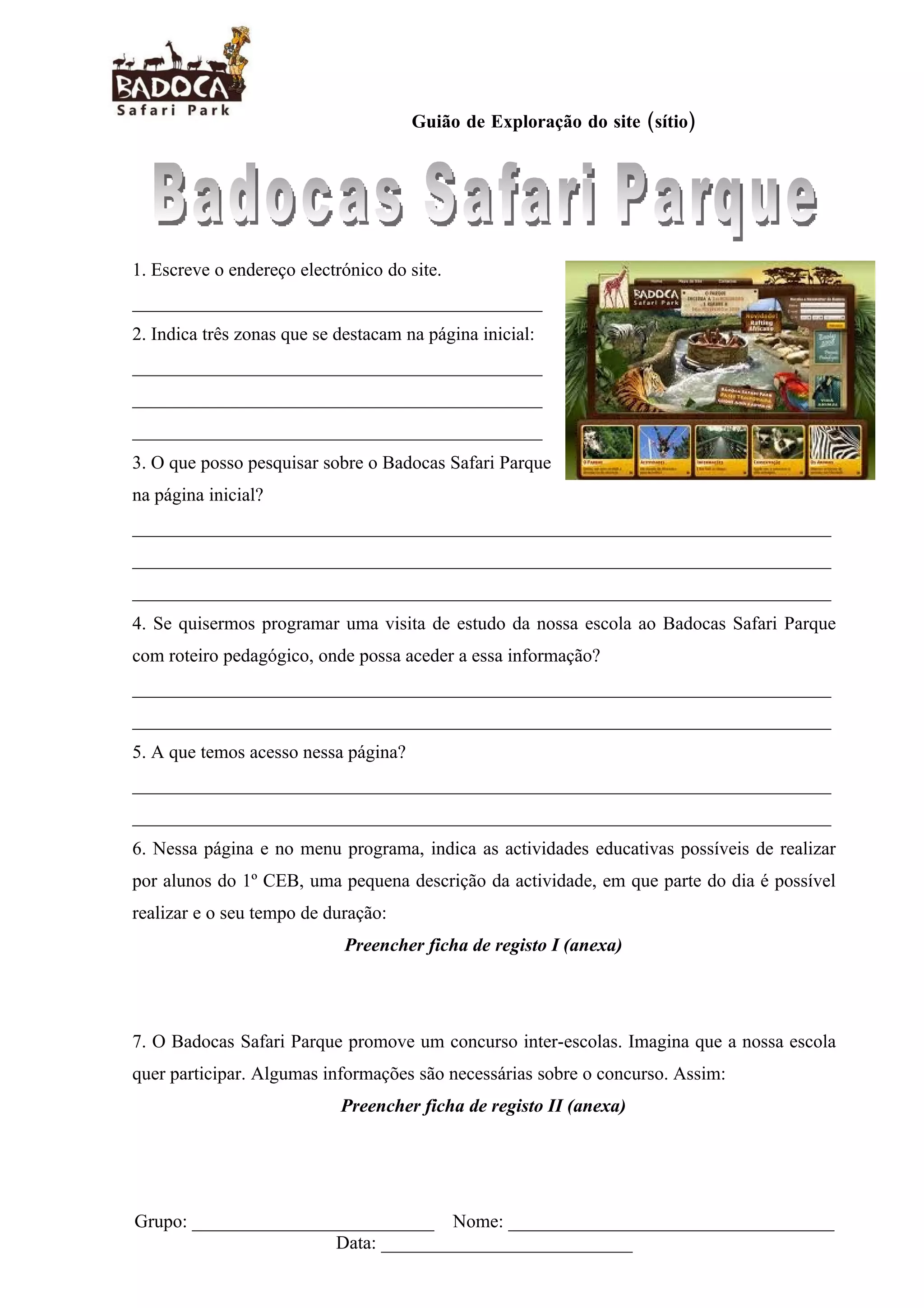 Este documento fornece instruções para explorar o site do Badocas Safari Parque e preencher fichas sobre atividades educativas e um concurso inter-escolas. Inclui perguntas sobre zonas destacadas na página inicial, informações sobre visitas de estudo e atividades para alunos do 1o CEB.