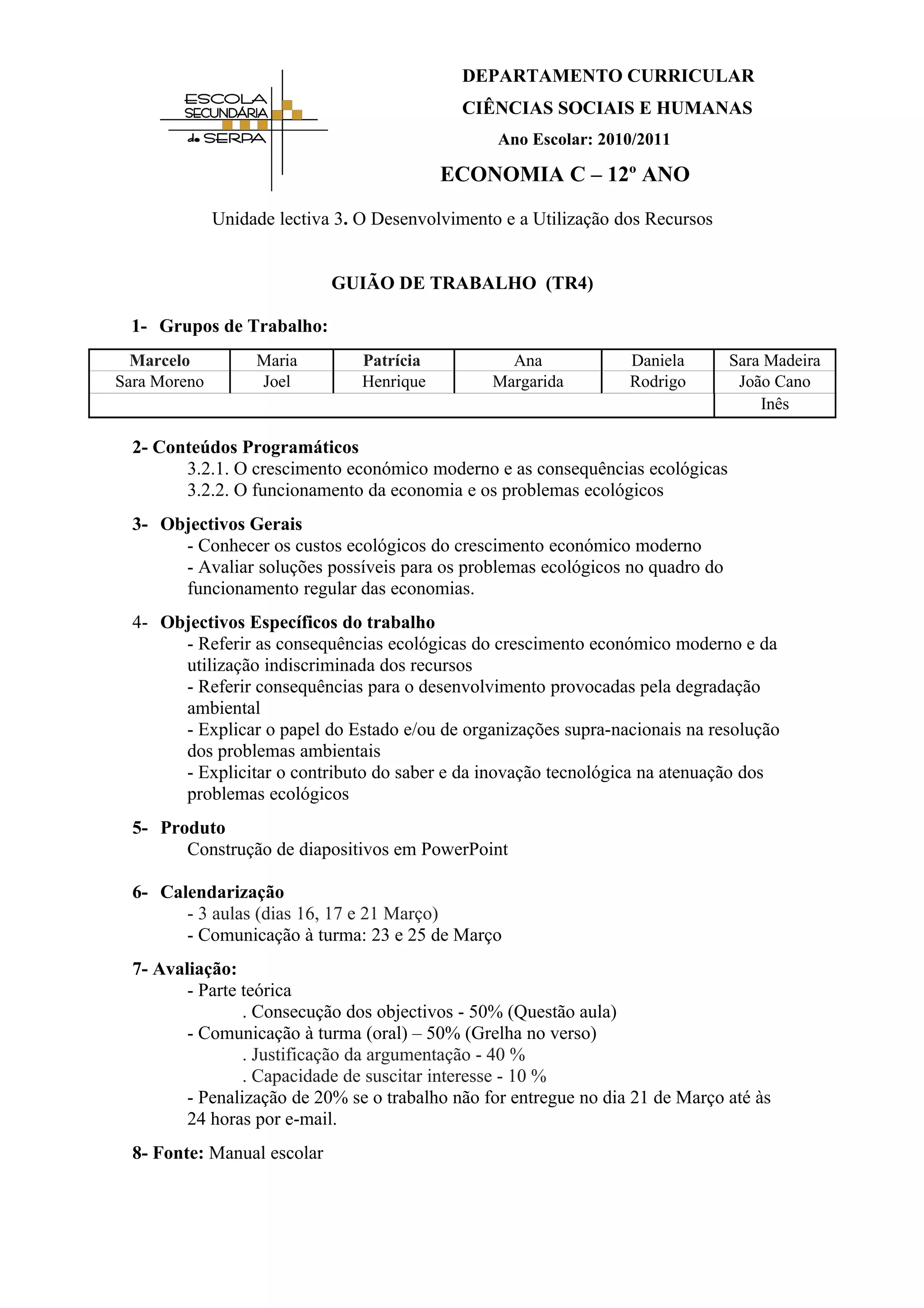 Os alunos foram divididos em grupos para realizar um trabalho sobre os custos ecológicos do crescimento econômico moderno e soluções para problemas ambientais. Eles devem construir diapositivos sobre as consequências ecológicas do crescimento e da utilização de recursos, explicando o papel do Estado na resolução de problemas ambientais. O trabalho será avaliado com base na parte teórica e na comunicação à turma.