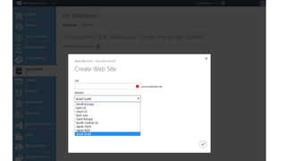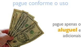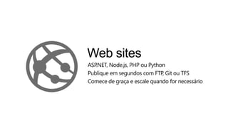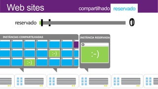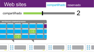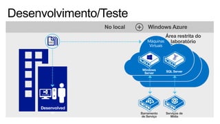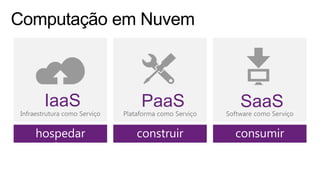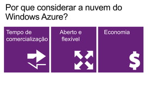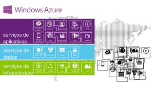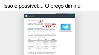 O documento apresenta conceitos sobre cloud computing, comparando as opções de construir uma infraestrutura própria versus utilizar serviços em nuvem. Apresenta também alguns serviços do Azure como Web Sites, Mobile Services e Media Services, além de conceitos como armazenamento, virtualização e identidade.