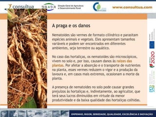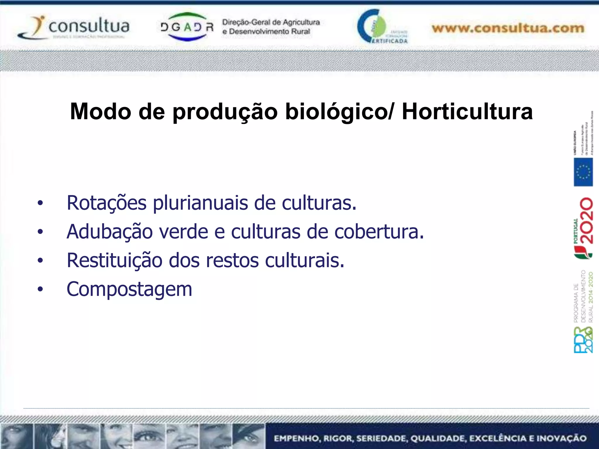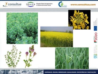 Este documento discute as considerações para planejamento de culturas hortícolas em modo de produção biológico, incluindo a importância das rotações plurianuais de culturas, adubação verde e compostagem para aumentar a fertilidade do solo e reduzir pragas e doenças. Recomenda-se intervalos entre culturas da mesma família e precedentes culturais favoráveis. Exemplos de rotações e consociações são fornecidos.