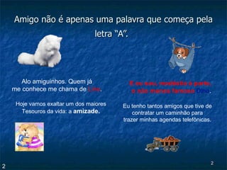 O documento discute a importância da amizade, definindo-a como um sentimento que se aprofunda com o tempo e se solidifica nos momentos difíceis. Descreve características de um verdadeiro amigo, como ajudar o colega a estudar em vez de dar a resposta, emprestar um lenço caso ele precise e dividir uma capa de chuva. Enfatiza a necessidade de valorizar os amigos e ser gentil com eles.
