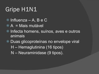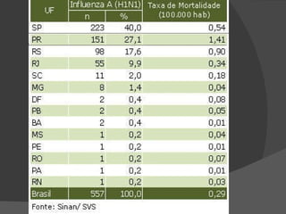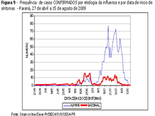 O documento discute a pandemia de gripe H1N1 de 2009, descrevendo as características do vírus, sintomas, grupos de risco, tratamento e medidas preventivas. A pandemia causou milhares de casos e centenas de mortes no Brasil e no mundo. As autoridades de saúde monitoraram a situação e recomendaram cuidados para conter a propagação do vírus.