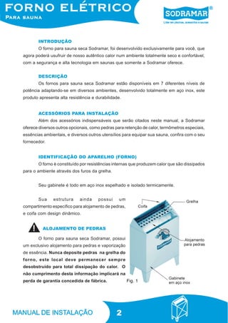 O documento fornece instruções para instalação de um forno para sauna seca, incluindo identificação dos componentes, modelo de ambiente, instalação elétrica, operação do termostato e regras de segurança.
