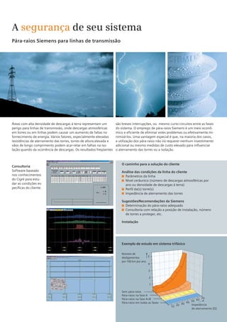 O documento discute pára-raios da Siemens para linhas de transmissão de energia. Ele descreve como pára-raios podem aumentar a confiabilidade do sistema ao proteger contra descargas atmosféricas e reduzir desligamentos. A Siemens oferece consultoria para selecionar o pára-raios apropriado e instalação para atender às condições específicas do cliente.