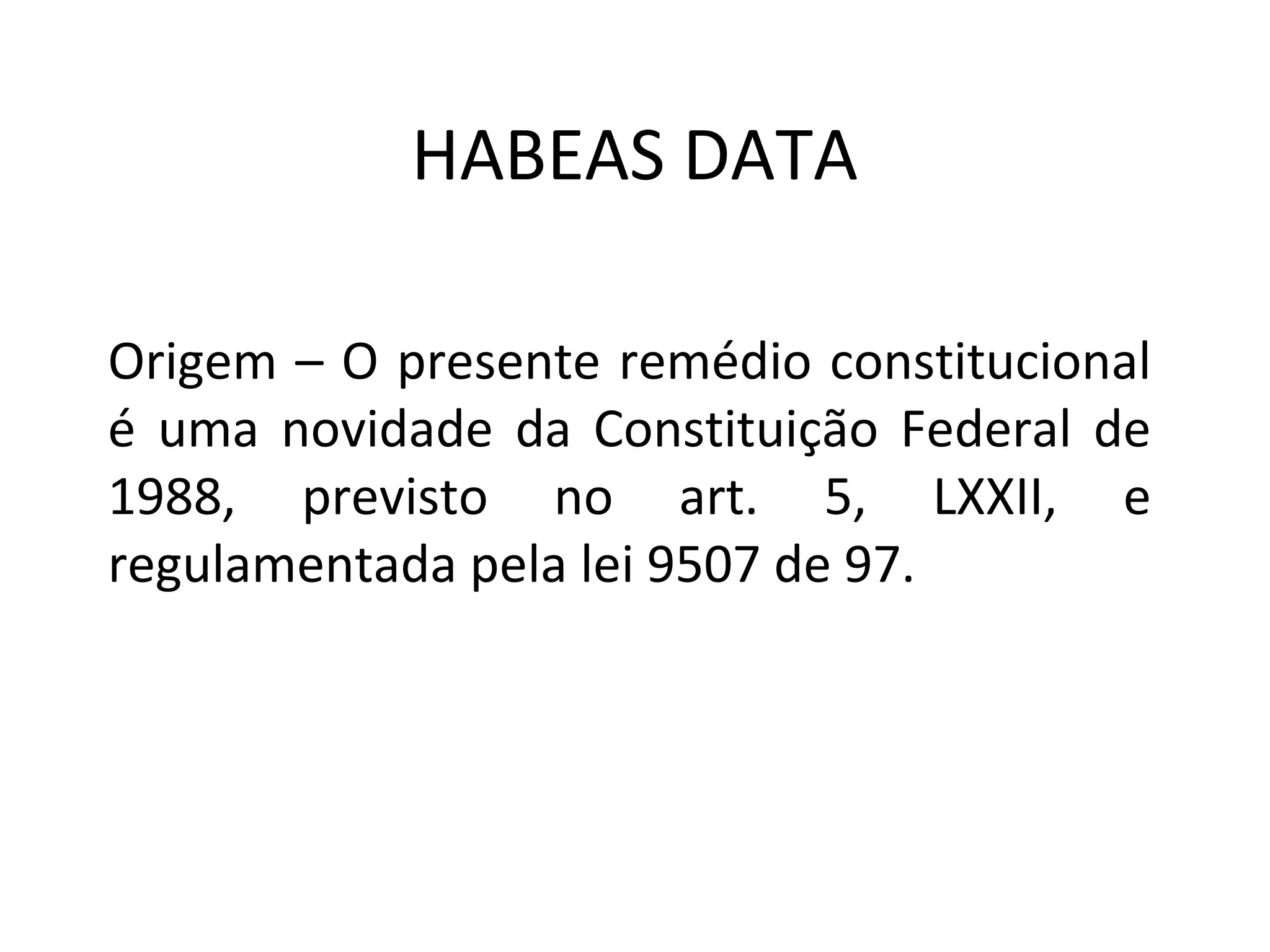 O documento descreve o habeas data no Brasil, definindo-o como um remédio constitucional previsto na Constituição de 1988 que permite (1) o acesso a informações sobre o impetrante mantidas por órgãos públicos, (2) a retificação de dados e (3) a contestação de dados. Também define os aspectos processuais do habeas data como legitimidade ativa, competência e procedimento.
