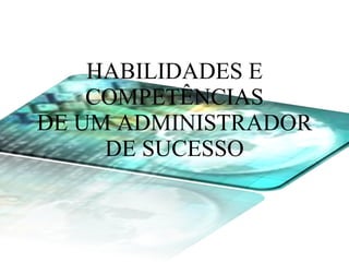O documento discute as habilidades e competências importantes para um administrador de sucesso. Ele destaca que um administrador de sucesso deve ser um aprendiz constante, capaz de se adaptar às mudanças e focar no aprendizado. Além disso, ele deve saber utilizar princípios, técnicas, ferramentas administrativas e recursos de resolução de problemas.