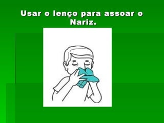 O documento lista importantes hábitos de higiene pessoal e no ambiente como usar lenços para assoar o nariz, tomar banho diariamente, pentear os cabelos, lavar as mãos, manter a casa limpa e escovar os dentes após as refeições para promover a saúde e o bem-estar.