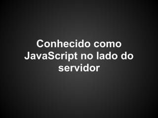 Guilherme Quental apresenta NodeJS. Ele explica que NodeJS é mais do que apenas JavaScript no lado do servidor e é definido por I/O não bloqueante e sua API em JavaScript. NodeJS é totalmente modular e composto por diversos módulos como File System, TCP, HTTP e Buffer.