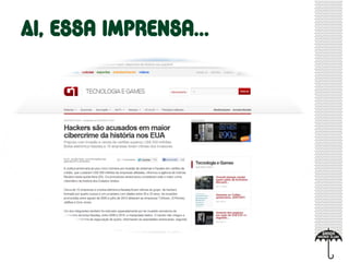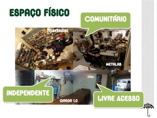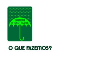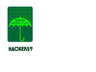 O documento apresenta fotos e discussões sobre hackerspaces e hacking ético. Inclui também emails recebidos pelo Garoa Hacker Clube solicitando serviços de hacking ilegal, como quebra de senhas e invasão de sistemas, os quais foram recusados.