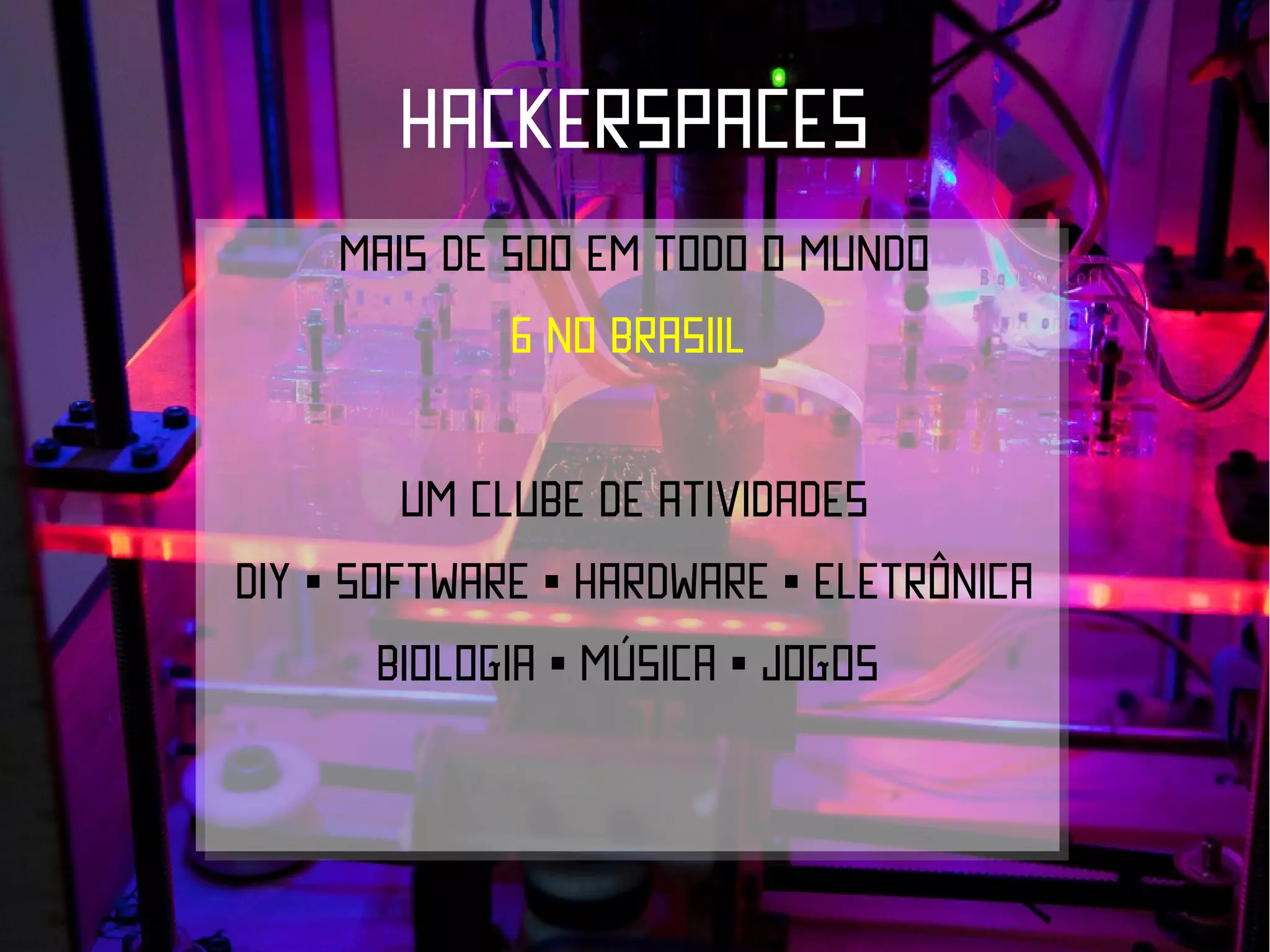 O documento descreve hackerspaces, locais onde pessoas se reúnem para compartilhar conhecimentos e recursos para projetos DIY (faça você mesmo) de hardware, software, eletrônica e outros. Existem mais de 500 hackerspaces em todo o mundo, incluindo 6 no Brasil. Essas comunidades promovem a criatividade, o compartilhamento e alternativas baratas para problemas técnicos e econômicos.