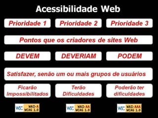 A acessibilidade na Web significa permitir o acesso a todos independentemente de limitações, ferramentas ou situações. Dados do IBGE mostram que quase metade da população brasileira possui alguma deficiência ou limitação e que a maioria dos sites governamentais ainda não é acessível de acordo com leis e normas brasileiras. Boas práticas como descrições, atalhos, mapas e validações podem tornar sites acessíveis a todos.