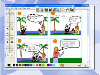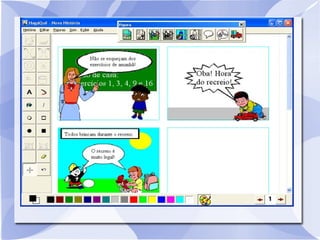 O documento descreve o software HagáQuê, um editor de histórias em quadrinhos com fins pedagógicos. O HagáQuê foi desenvolvido para facilitar a criação de histórias em quadrinhos por crianças e possui recursos suficientes para não limitar a imaginação. O documento explica como usar as ferramentas do software para inserir figuras, texto e criar uma história em quadrinhos abordando um tema estudado.