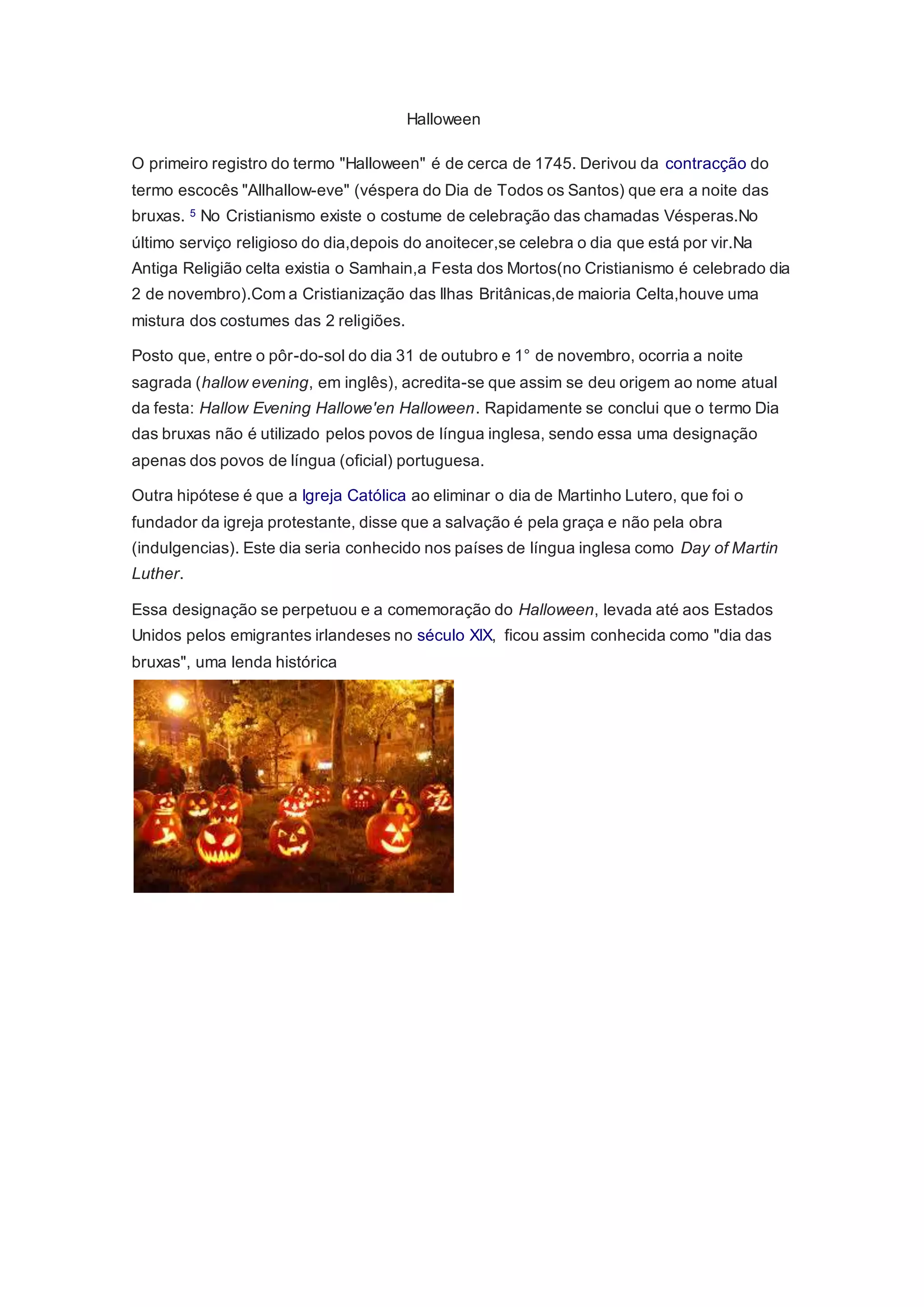 O Halloween tem suas origens na festa celta Samhain e na tradição cristã do Dia de Todos os Santos. Com a cristianização da Grã-Bretanha, as duas tradições se misturaram, resultando na celebração do Halloween em 31 de outubro, entre o pôr do sol e 1o de novembro. O nome "Halloween" deriva da contração de "Allhallow-eve", que significa véspera do Dia de Todos os Santos.