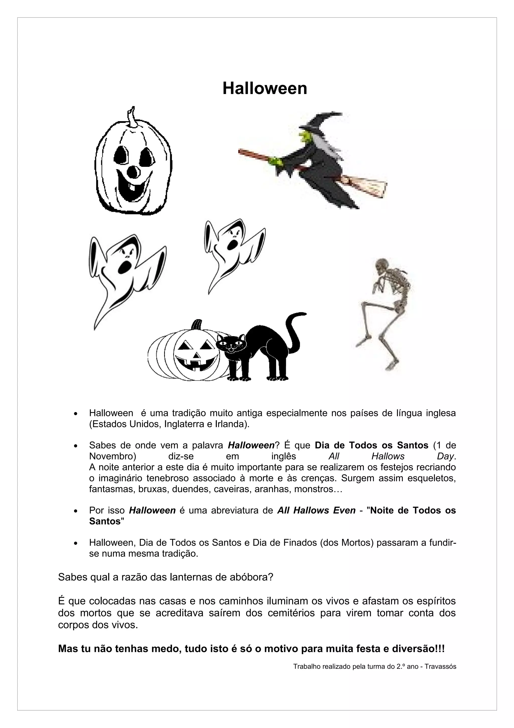 Halloween é uma tradição antiga celebrada principalmente nos países de língua inglesa na noite anterior ao Dia de Todos os Santos, envolvendo fantasias assustadoras e lanternas de abóbora para iluminar e afastar espíritos, sendo hoje em dia mais uma ocasião de diversão.