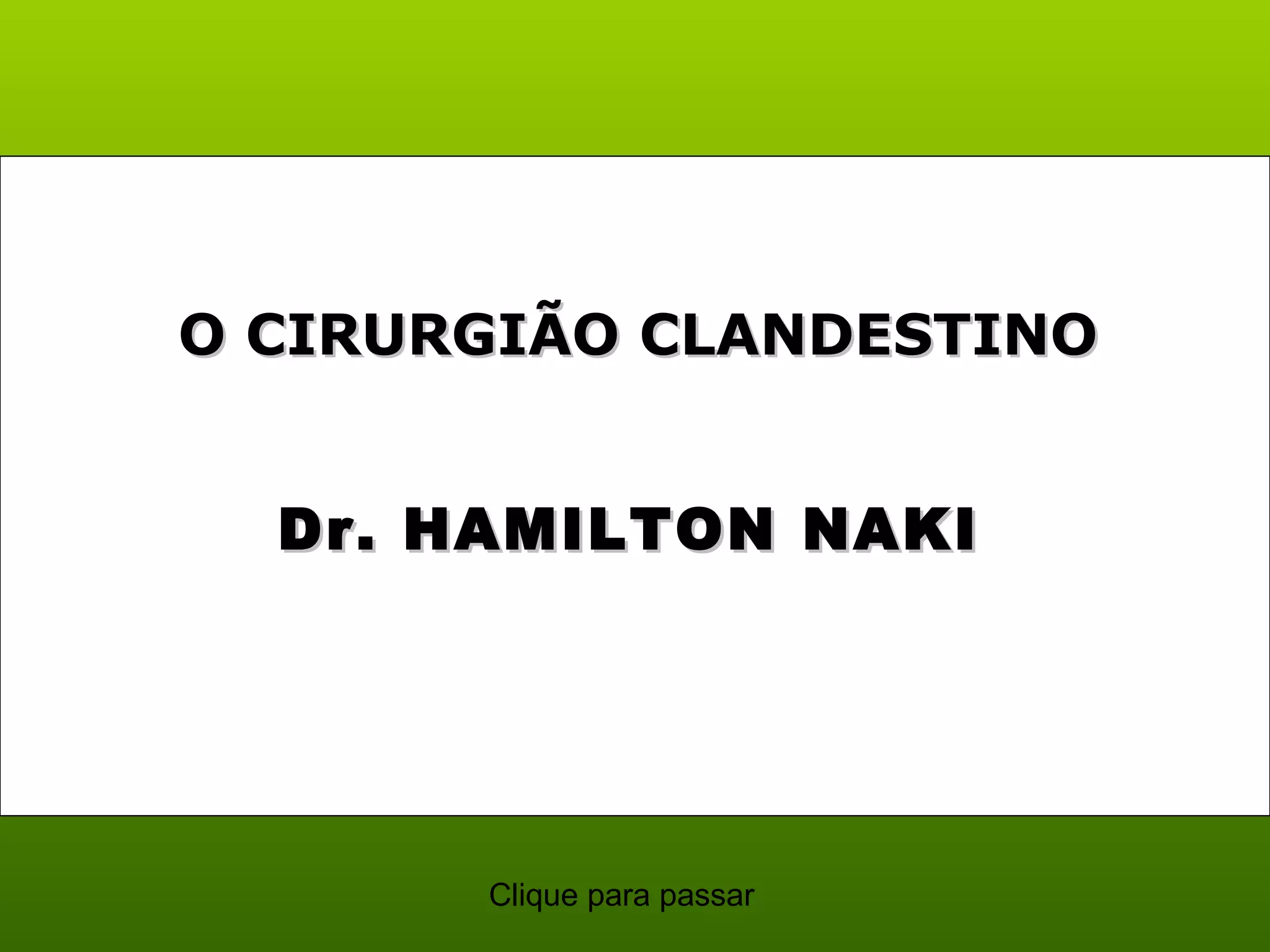 Hamilton Naki era um cirurgião clandestino negro na África do Sul do apartheid que ajudou a realizar o primeiro transplante de coração com sucesso em 1967, apesar da discriminação que sofreu. Ele ensinou cirurgia por 40 anos sem formação médica oficial e recebia um salário muito baixo, vivendo em condições precárias, mas nunca reclamou e sempre deu o seu melhor.