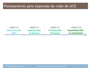 O documento descreve as etapas de maturação de um programa de design centrado no usuário (UCD) em uma organização ao longo de 10 anos. Começa com 1-2 testes de usabilidade e se expande para formalizar processos, treinar equipes internas, realizar pesquisas em campo e integrar UCD em todos os processos da organização. O objetivo final é institucionalizar a cultura centrada no usuário.