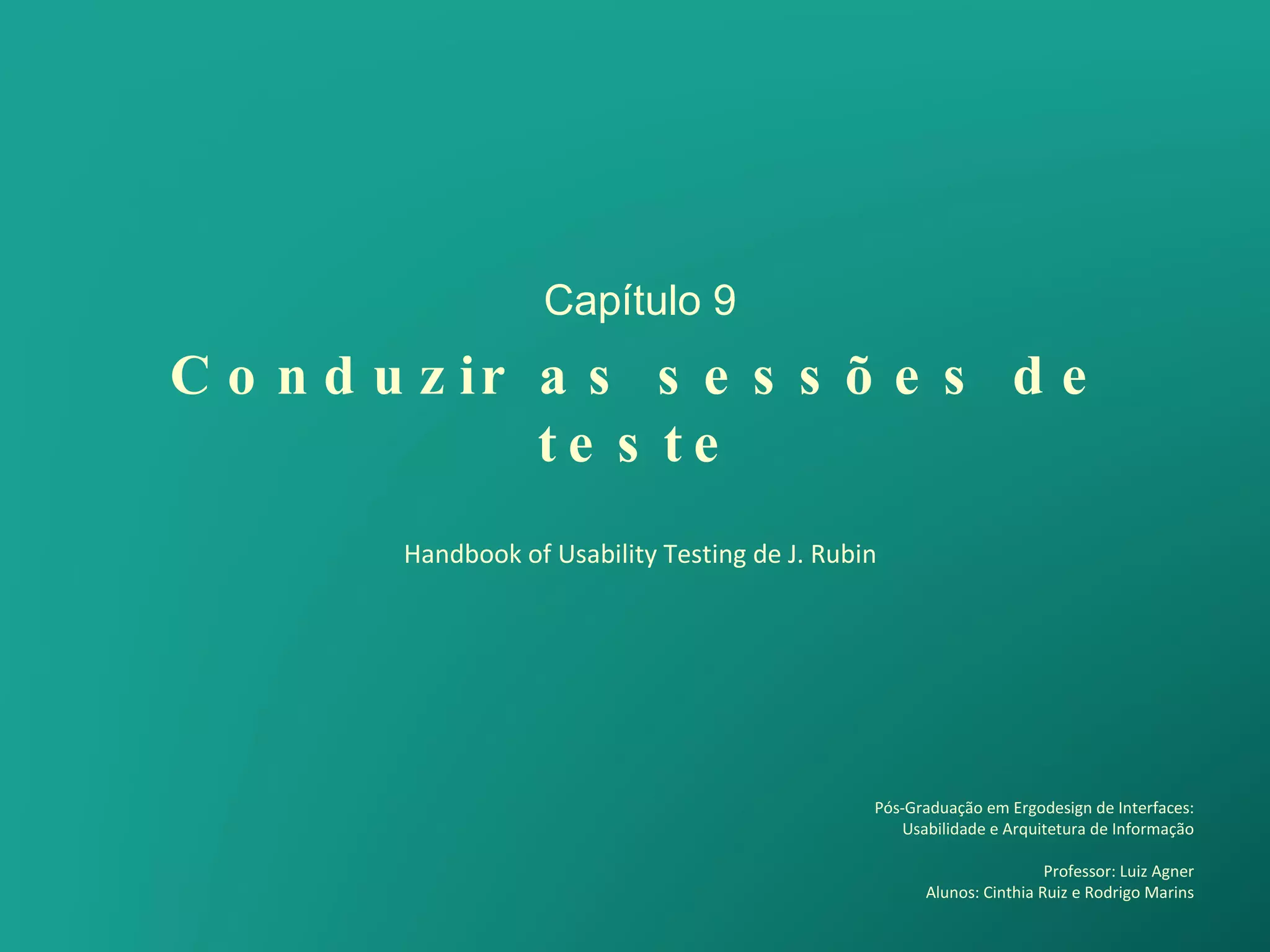 Capítulo 9 Conduziras sessões de teste Handbook of Usability Testing de J. Rubin Pós-Graduação em Ergodesign de Interfaces: Usabilidade e Arquitetura de Informação Professor: Luiz Agner Alunos: Cinthia Ruiz e Rodrigo Marins