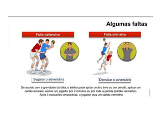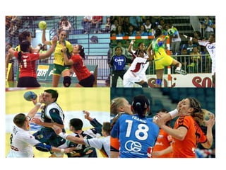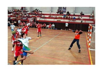 O documento resume a história e as regras básicas do handebol. O esporte surgiu na Alemanha no século XIX e se espalhou pela Europa. Inicialmente era praticado ao ar livre, mas passou a ser jogado em quadras cobertas. No Brasil, foi introduzido por imigrantes alemães no sul do país. As partidas ocorrem entre dois times de sete jogadores em uma quadra de 40x20m, com o objetivo de marcar gols na meta adversária.