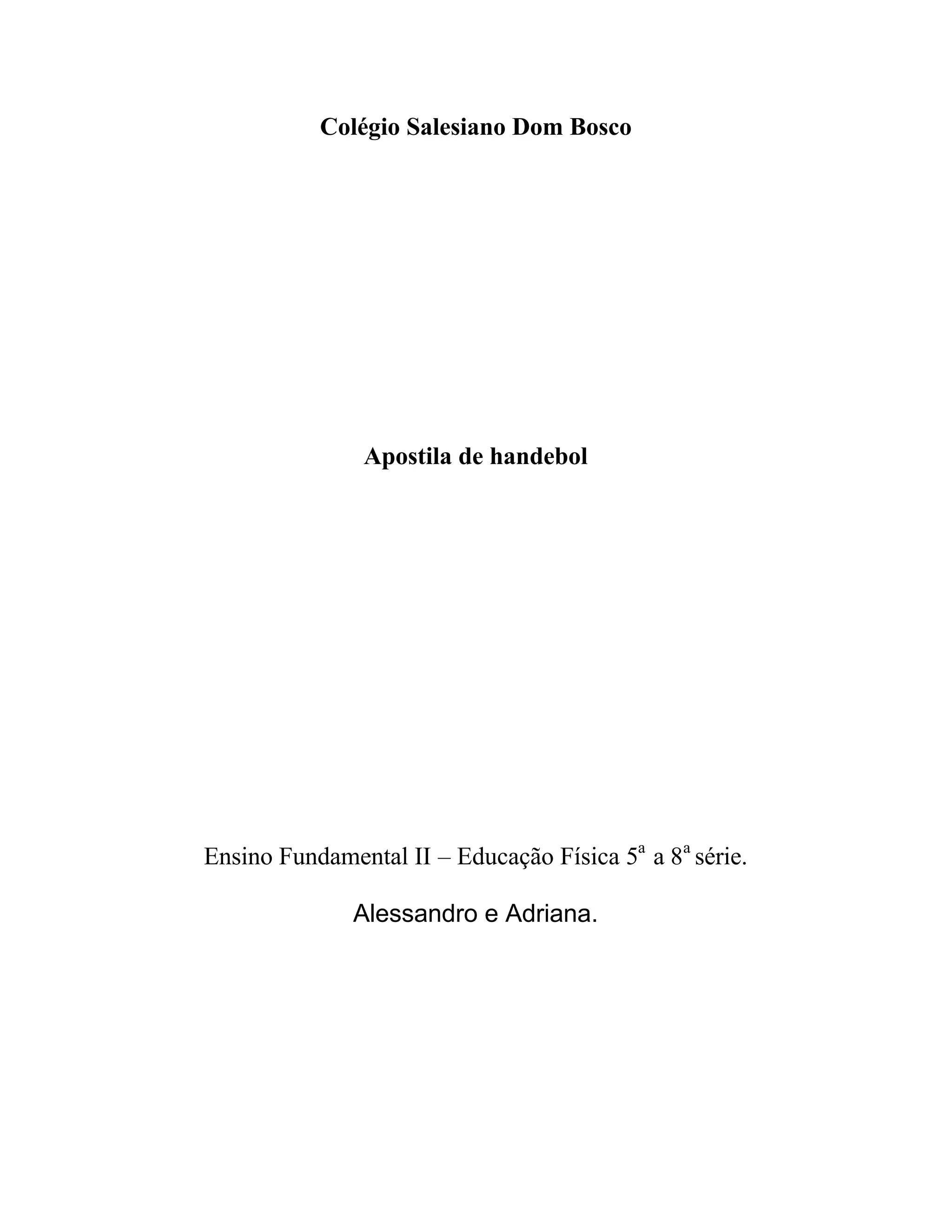 1) O documento é uma apostila sobre handebol que descreve as regras e conceitos básicos do esporte, incluindo detalhes sobre a quadra, duração das partidas, equipes, substituições, papel do goleiro e regras de manuseio da bola.