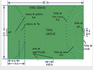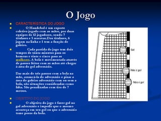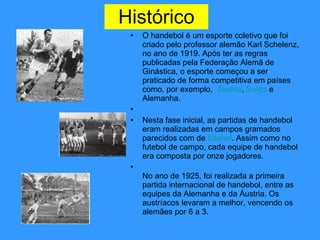 O handebol foi criado em 1919 por Karl Schelenz na Alemanha e se espalhou para países como Áustria e Suíça. As primeiras partidas eram realizadas em campos de futebol com 11 jogadores por time. Em 1925, a primeira partida internacional ocorreu entre Alemanha e Áustria. O handebol possui fundamentos técnicos como finta, drible e arremesso, além de regras como os dois tempos de 30 minutos, 7 jogadores por time e a proibição de trocar a bola de mão.