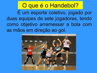 O documento descreve as origens, regras e fundamentos básicos do handebol. O handebol surgiu na Alemanha em 1914 e era originalmente jogado em campos de futebol com 11 jogadores por time. Atualmente é jogado por duas equipes de 7 jogadores cada em uma quadra, com o objetivo de arremessar a bola no gol adversário usando as mãos. O documento detalha as regras de jogo, posições, táticas defensivas e ofensivas.