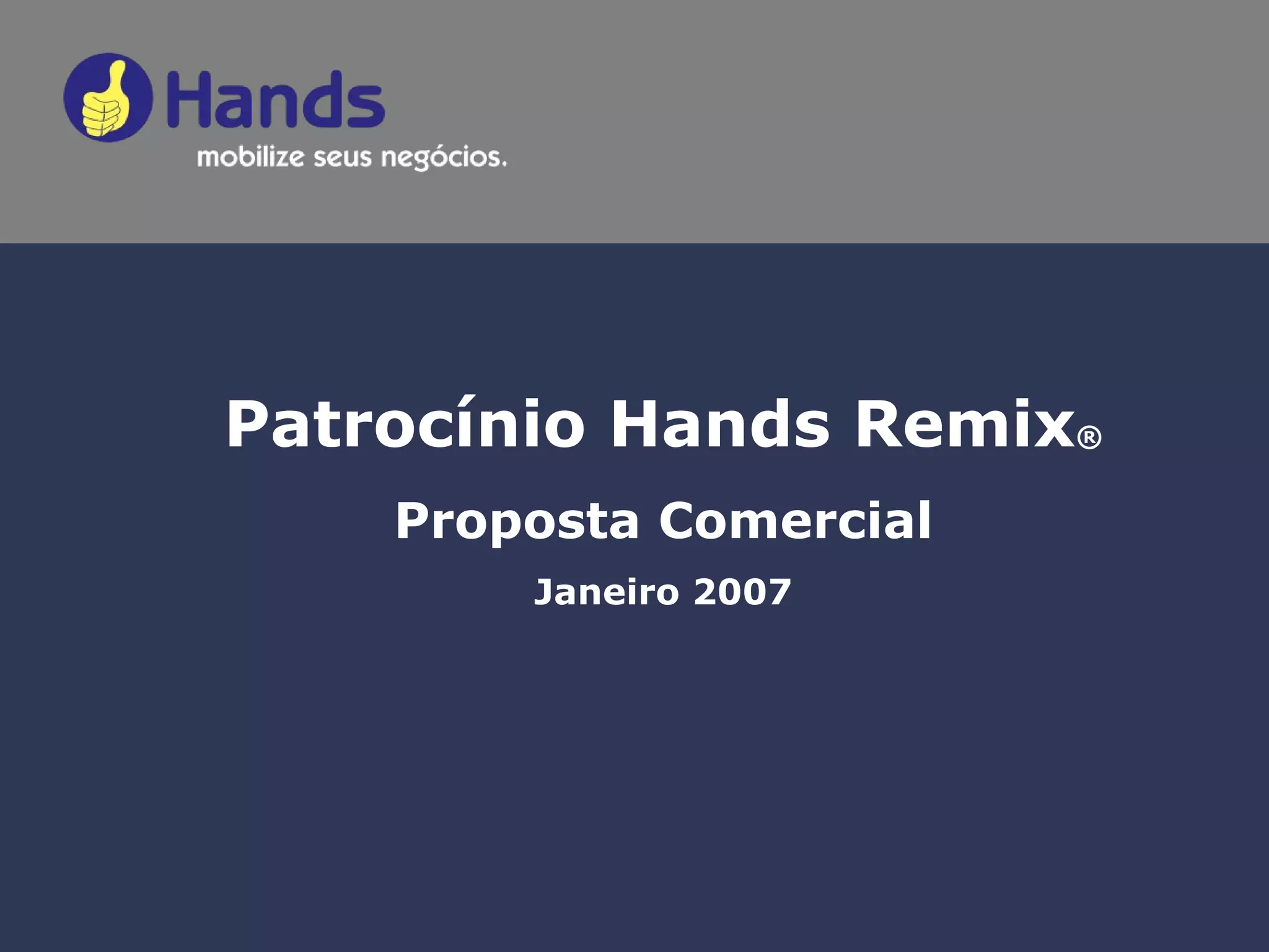 Este documento propõe um patrocínio para a GOL no projeto Hands Remix®, que oferece serviços móveis integrados para consumidores. O projeto lançará vários serviços até o fim de 2008, incluindo busca, comparação de preços, redes sociais e recomendações. O patrocínio inclui anúncios no portal Hands, boletins, eventos e mídia espontânea associada aos lançamentos do projeto.