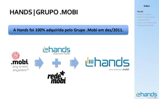 Este documento fornece um resumo sobre a Hands e sua rede de publicidade móvel. A Hands possui mais de 12 anos de experiência na comercialização e gerenciamento de publicidade móvel e atua por meio de duas redes: Premium e Performance. A rede Premium da Hands é composta por mais de 120 parceiros de conteúdo premium segmentados em notícias, entretenimento, esportes, mulheres, homens, jovens, mídia social e serviços.