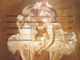 O documento resume um trabalho de grupo sobre o escritor dinamarquês Hans Christian Andersen. O grupo analisou sua biografia, obras principais como os Contos e o conto O Soldadinho de Chumbo. As alunas gostaram de fazer o trabalho e aprenderam sobre o importante autor do século XIX e suas muitas obras infantis.