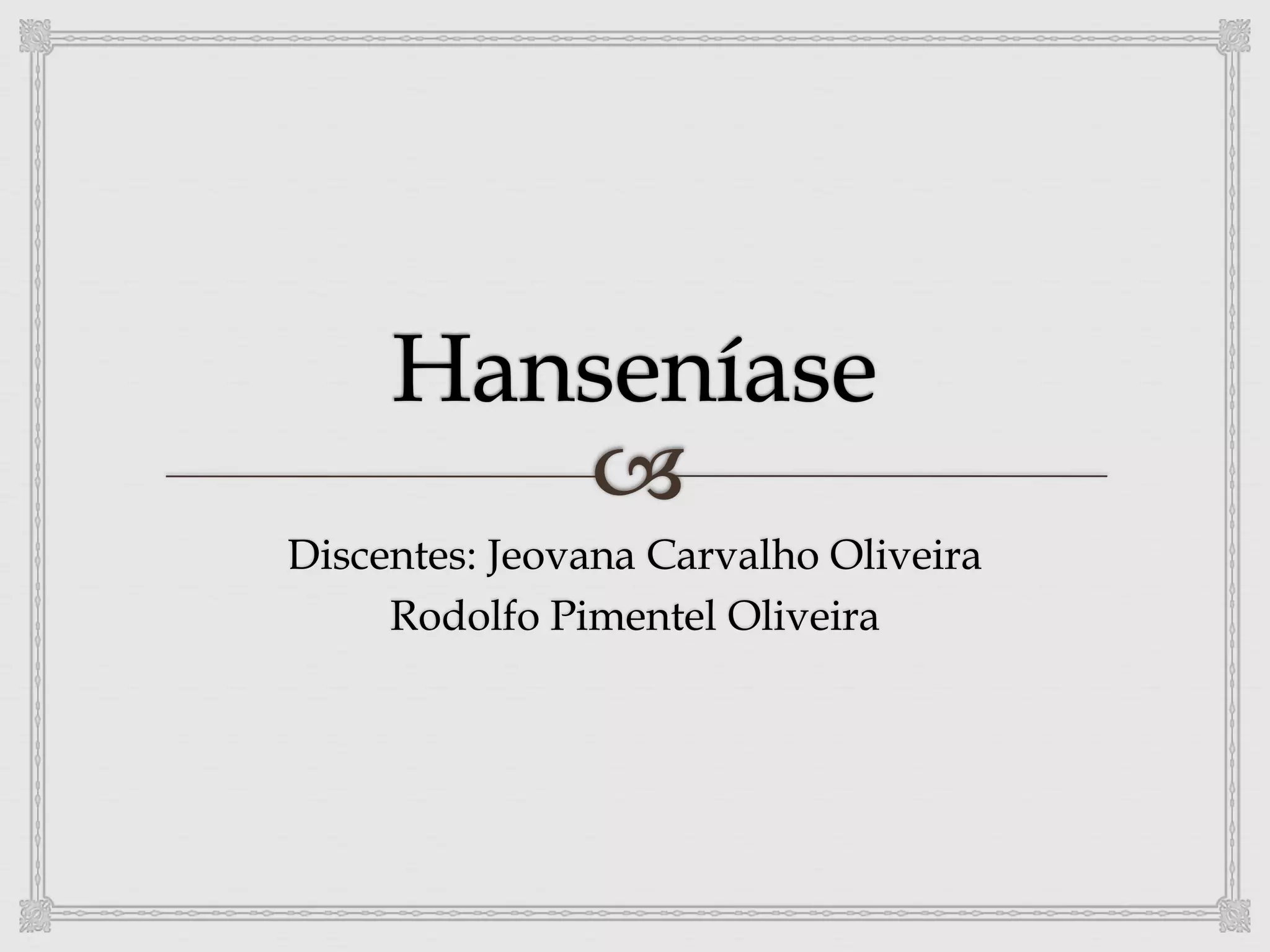 O documento descreve a hanseníase, uma doença infecciosa causada pelo bacilo de Hansen que afeta principalmente a pele e os nervos periféricos. A transmissão ocorre por via aérea e o período de incubação é de 2 a 7 anos. O diagnóstico é clínico e envolve avaliação dermatológica e neurológica. O tratamento é feito com poliquimioterapia por até 18 meses.