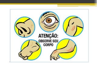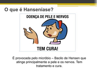 A hanseníase é causada por um micróbio que afeta principalmente a pele e os nervos, tem tratamento e cura. É transmitida pelo contato prólongado com pessoas doentes sem tratamento, porém a maioria das pessoas é resistente e não adoece. Sinais como manchas na pele sem sensibilidade podem indicar a doença.