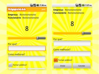 O documento resume a jornada de desenvolvimento de um aplicativo móvel para diário de felicidade de um indivíduo. Começou como uma ideia de medir a felicidade de funcionários em empresas e evoluiu para um produto focado no usuário individual revisar seu próprio bem-estar ao longo do tempo. O desenvolvedor tem vasta experiência em várias linguagens e é um defensor do framework ágil Scrum.