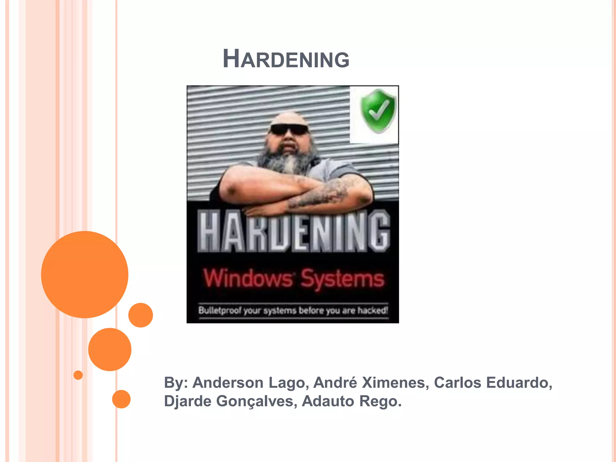 O documento discute técnicas de hardening para proteger sistemas contra invasores, incluindo remover itens desnecessários, aplicar patches, fechar portas de rede, usar firewalls e detecção de intrusão. Ele também fornece orientações sobre como configurar contas de usuário, criptografar arquivos, gerenciar serviços e auditoriar senhas para melhorar a segurança.