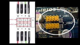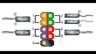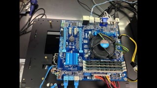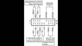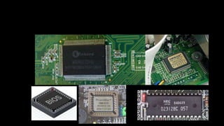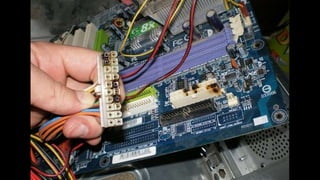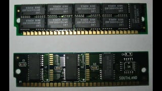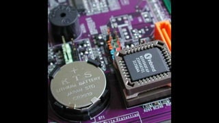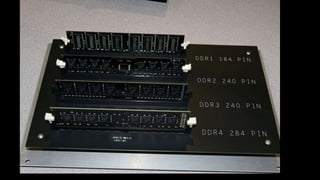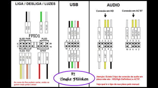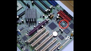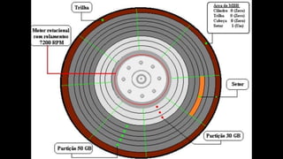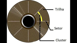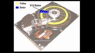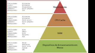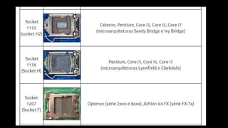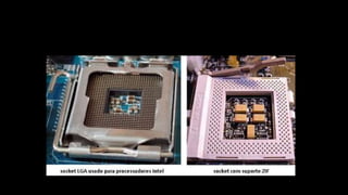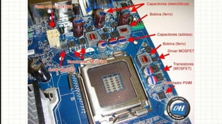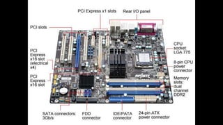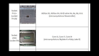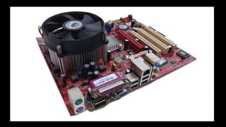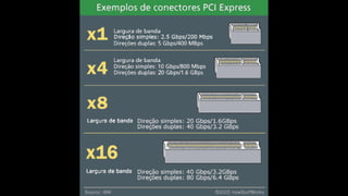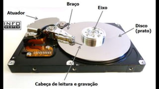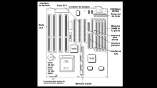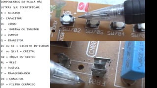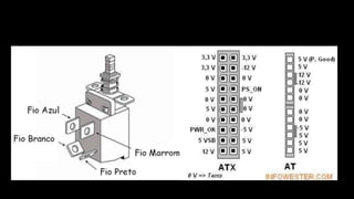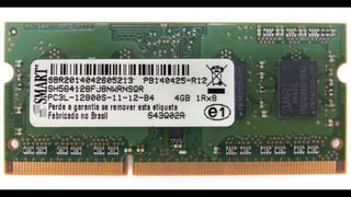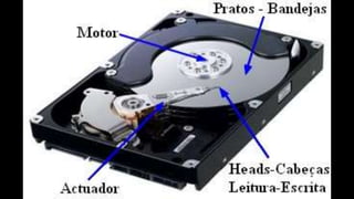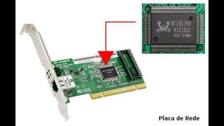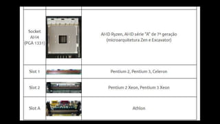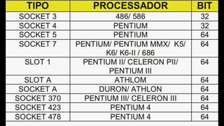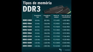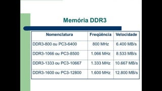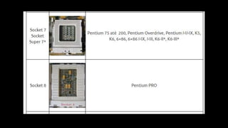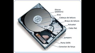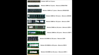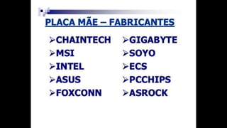 O documento resume os principais componentes de hardware de um computador, incluindo a placa-mãe, memória RAM, HD, BIOS e tipos de placas-mãe. Explica que a placa-mãe conecta todos os componentes e fornece energia, e descreve os padrões AT, ATX, DDR e tipos de memória.