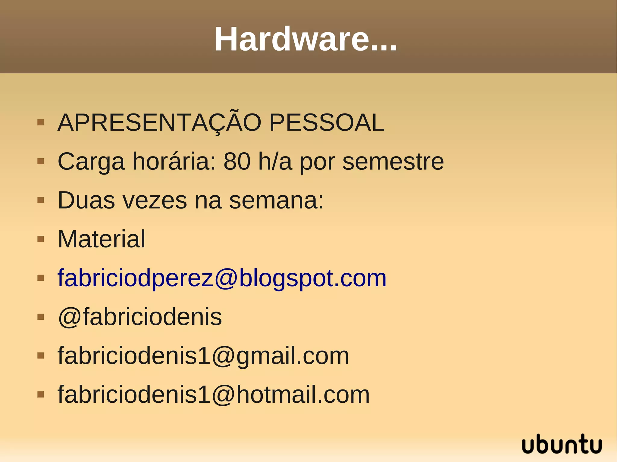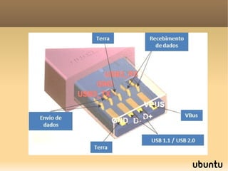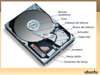 Este documento fornece informações sobre hardware de computadores, incluindo componentes internos como placa-mãe, memória RAM, processador e barramentos. Também discute periféricos, interfaces de entrada e saída e formatos de memória. O documento visa ensinar estudantes sobre os fundamentos do hardware de computadores.
