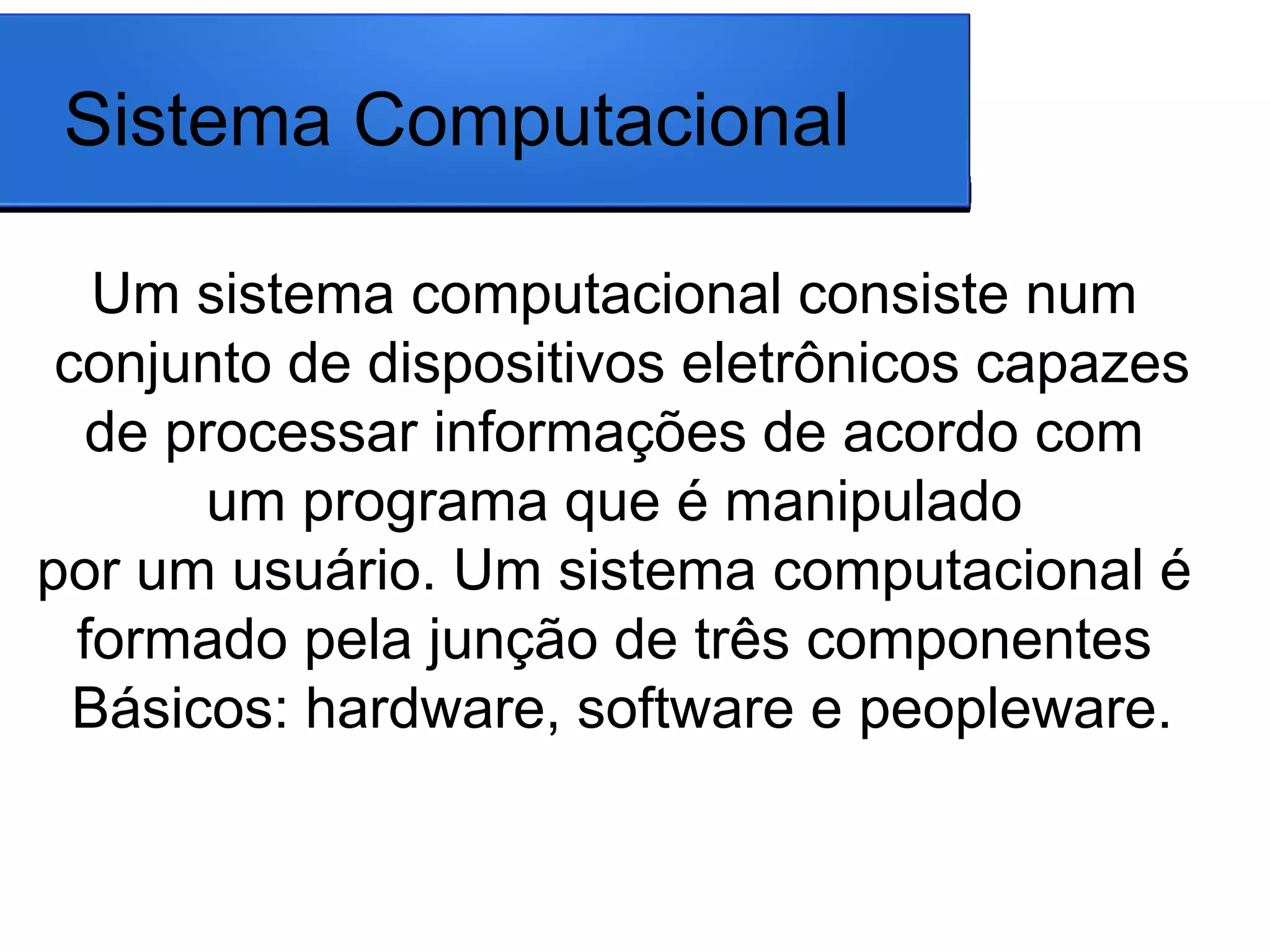 Um sistema computacional consiste em hardware, software e pessoas que trabalham juntos para processar informações de acordo com programas. O hardware inclui dispositivos de entrada, saída e armazenamento como mouse, monitor, gabinete, memória, HD, fonte de energia e placa-mãe. O software são os programas manipulados pelos usuários. E o peopleware são as pessoas como usuários e programadores.