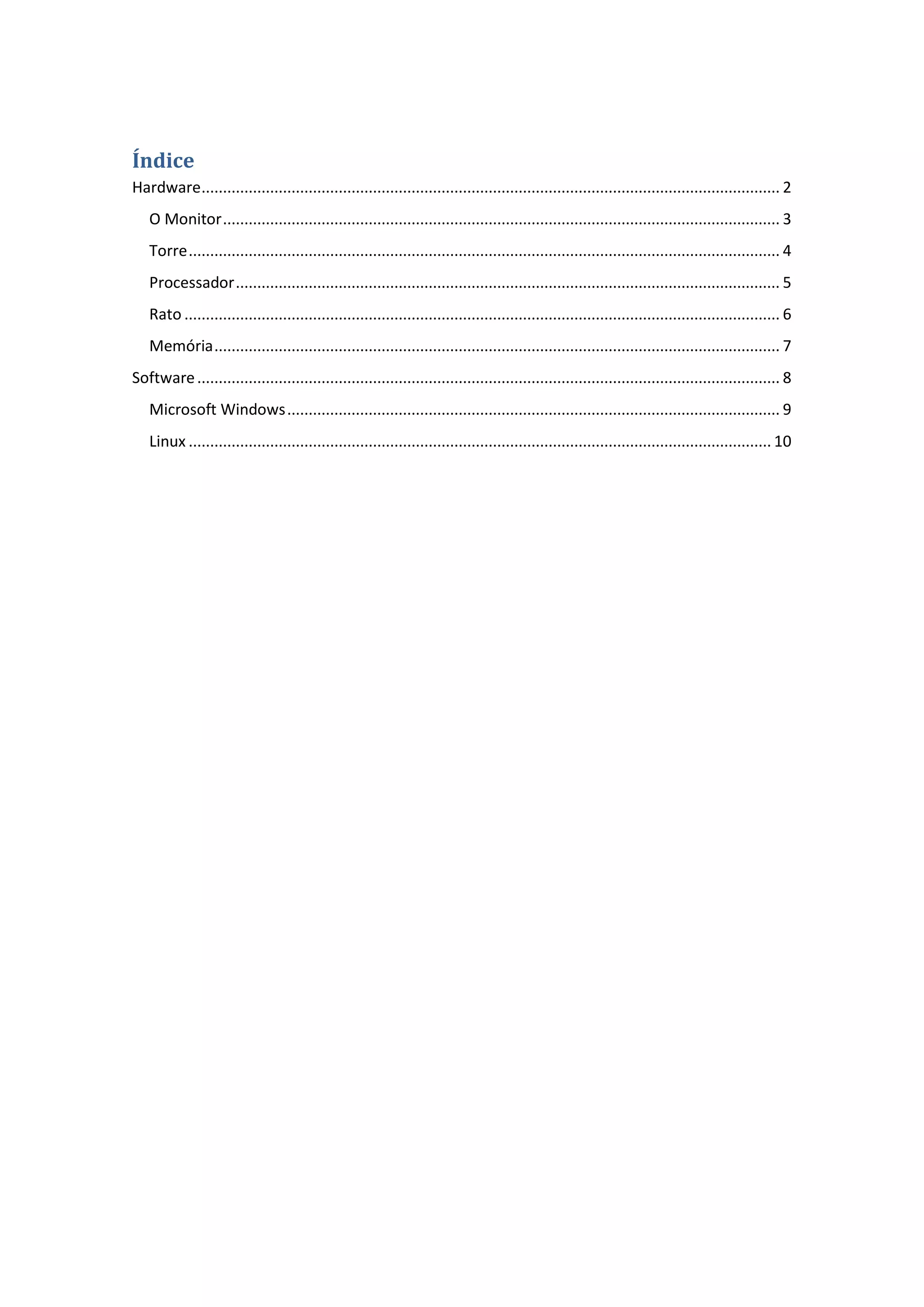 Este documento fornece um resumo de alguns dos principais componentes de hardware e software de computadores. Ele discute brevemente o monitor, a torre, o processador, o mouse, a memória, o Microsoft Windows e o Linux.