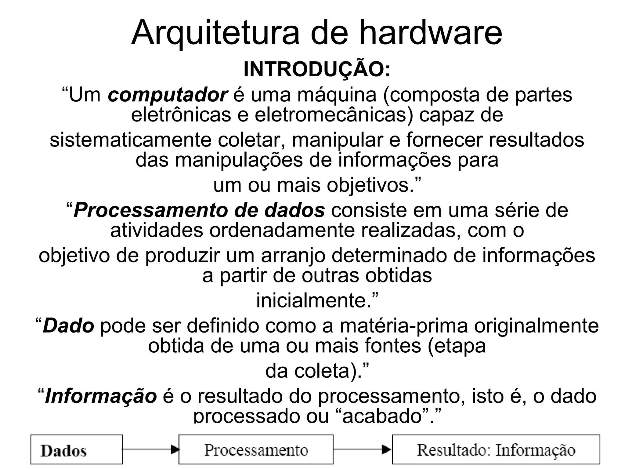 O documento introduz os conceitos básicos de arquitetura de hardware e sistemas de computação. Aborda tópicos como: 1) definição de computador, dados e informação; 2) conceitos de sistemas e sistemas de informação; 3) programas e execução dos mesmos pelo processador; 4) linguagens de programação e compilação vs interpretação; 5) níveis de programação; 6) representação de números em computador.